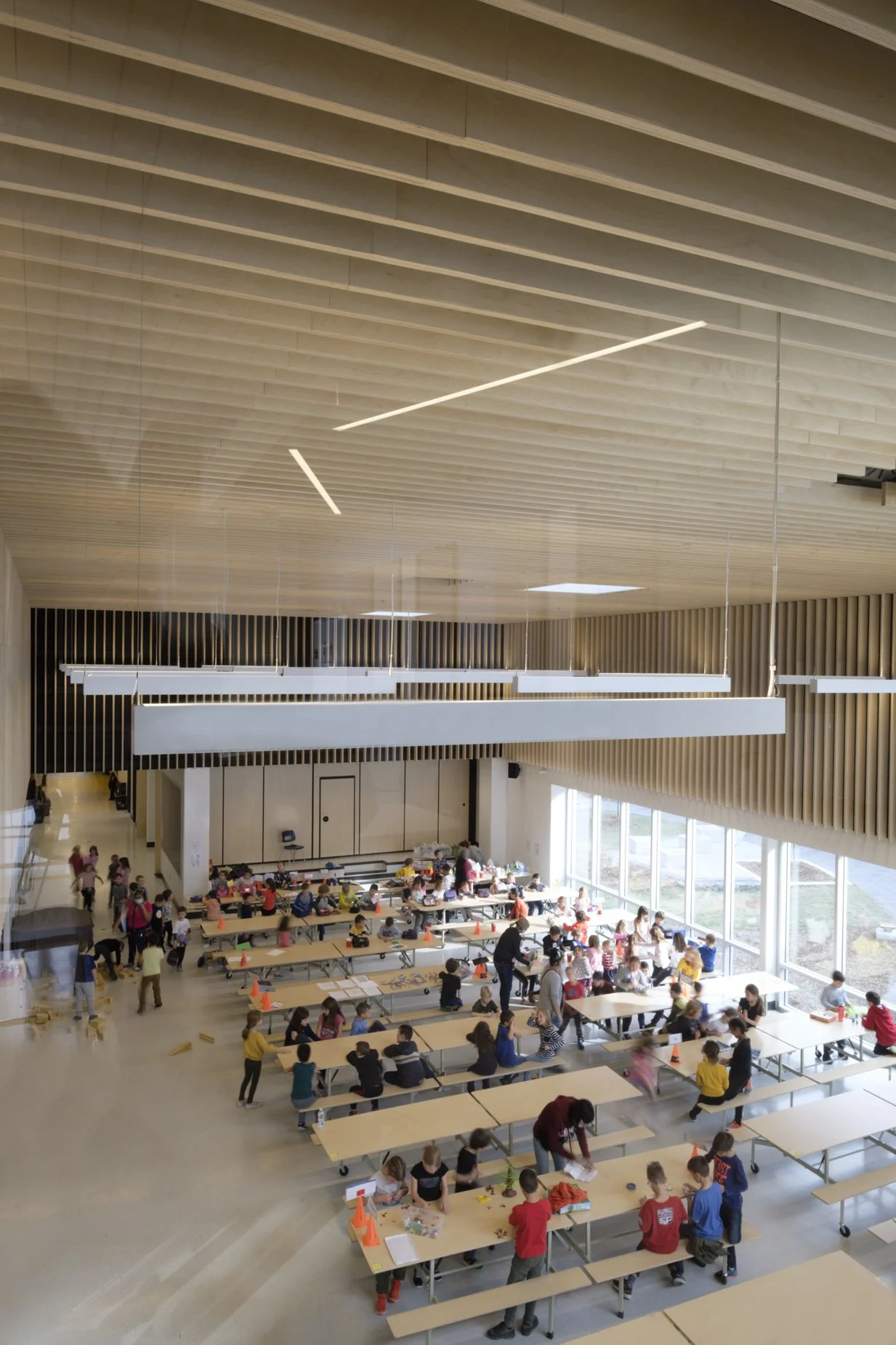 Le bâtiment ne comporte qu’un seul étage et des espaces distinctifs de dynamisation, d’apprentissage et d’apaisement y ont été soigneusement aménagés. Chaque classe possède une sous-classe, flexible et modulable en fonction des activités. L’enfant peut ainsi travailler avec divers intervenants, plutôt qu’un seul adulte. Ces zones d’enseignement partagées ont leur propre code de couleur, au sol et sur les murs, permettant aux enfants de s’approprier leur espace à l’intérieur de cette grande école. Chaque classe possède un puit de lumière ainsi qu’un mur fenestré afin de faire bénéficier tous les usagers du même éclairage naturel. De plus, les zones d’enseignement donnent directement accès à la cour extérieure dont l’aménagement paysager a été intégré de manière à révéler la biophilie aux usagers.
